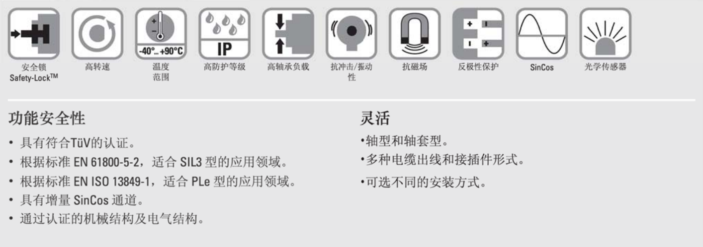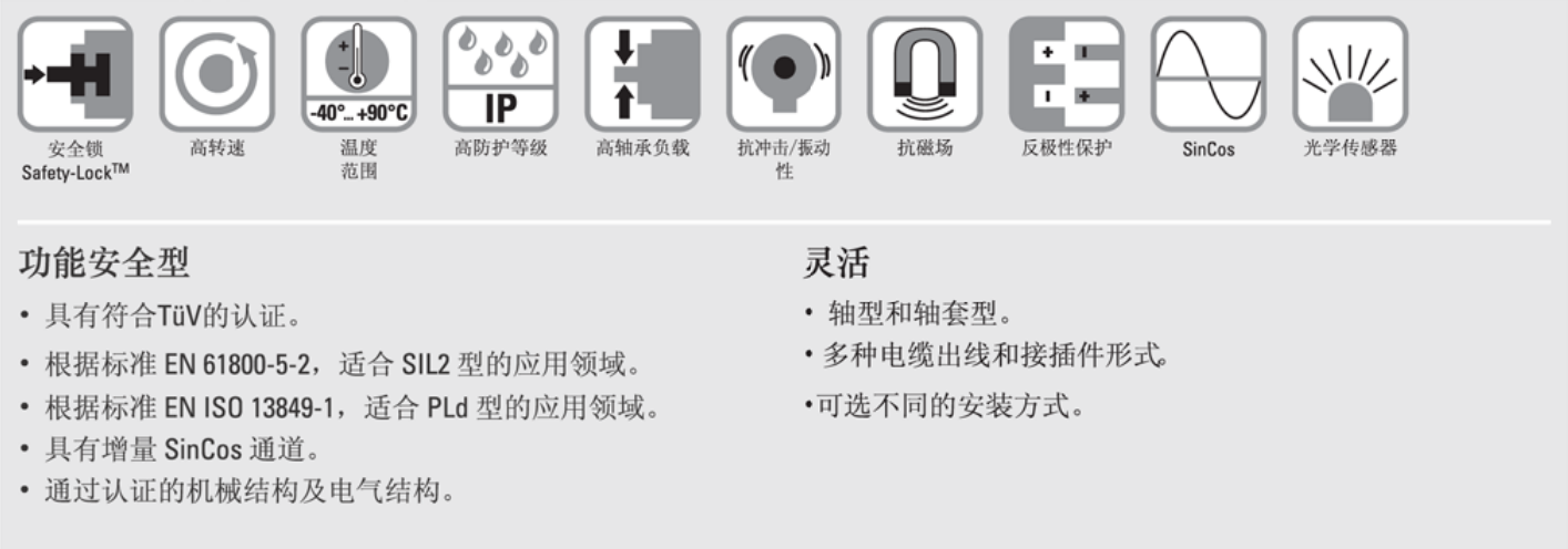 • 增量編碼器Sendix 5814FS2/5834FS2帶有SinCos接口,達到SIL2標準,符合EN 61800-5-2或符合EN ISO 13849-1的PLd,可確保在安全驅動技術領域的應用中實現可靠地運行